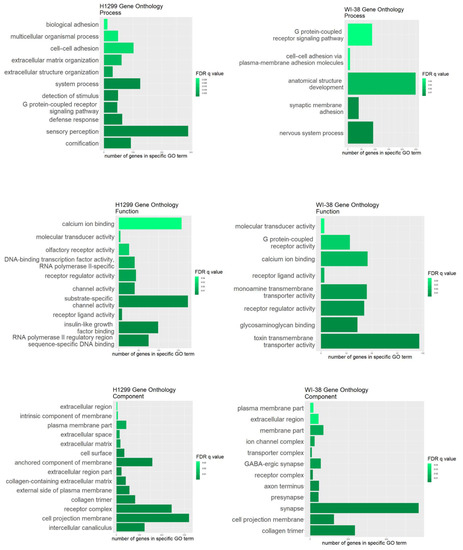 Although there are no statistically significant genes that overlap in the analysis of differentially expressed genes between H1299 and WI-38 cell lines, here we have several GO terms that are in common for both lines of cells. The common GO terms affecting the cellular components which were significantly enriched were mostly associated with cellular membrane (cell projection membrane, receptor complex and parts of the plasma membrane). The common GO terms affecting the cellular function were mostly involved in the regulation of the receptor and ligand activity and molecular transducer activity. Finally, the common GO terms affecting the biological cell process were mostly involved in G protein-coupled receptor signaling pathway.