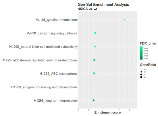 Gene set enrichment analysis identified multiple pathways that were significantly down- or up-regulated by overexpression of TLR5N592S overexpression in WI-38 and H1299 cell lines. Among them, we found that pathways participating in the antigen processing and presentation (FDR q value = 0.025194; enrich. score −1.4960678) and NK-cell mediated cytotoxicity (FDR q value = 0.042227; enrich. score −1.3609923) exhibit significant negative enrichment in H1299 cell line. There were no pathways with a positive enrichment score in GSEA for the H1299 cell line. For WI-38 cell line, we detected that calcium signaling pathway exhibits a significant negative enrichment score, while for tyrosine metabolism pathway we identified positive enrichment score (Table S3).