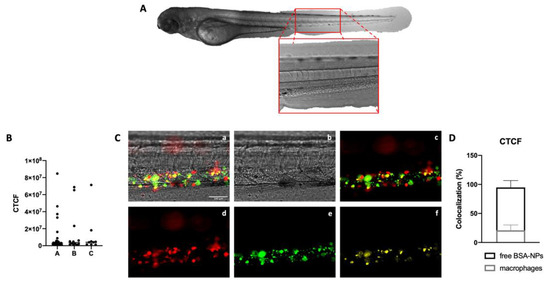 Zebrafish as a model for elimination studies: (A) Representation of the ROI chosen for the analysis of fluorescent signals in the Tg(mpeg1:mCherry) given by the presence of BSA-NPs. (B) Data analysis of the CTCF of the red-fluorescent areas (macrophages) of zebrafish randomly assigned to three different groups, suggesting that the fluorescent signal of macrophages is comparable between different animals. Data are reported as the median. (C) BSA-NPs were injected in the duct of Cuvier of transgenic line Tg(mpeg1:mCherry), and 24 hpi, ZF were analyzed through fluorescence microscopy. The upper left panel (a) represents the merge between macrophages (red, d), BSA-NPs (green, e), and the zebrafish’s tail (gray, b). In the merge (c) between macrophages (red, d) and BSA-NPs (green, e), it is possible to observe yellow spots given by their colocalization, better appreciable isolating them (f), representing BSA-NPs engulfed by macrophages. (D) Data analysis of the CTCF of the colocalized areas. All data are reported as the mean ± SD. Magnification 200×. Scale bar 100 μm.