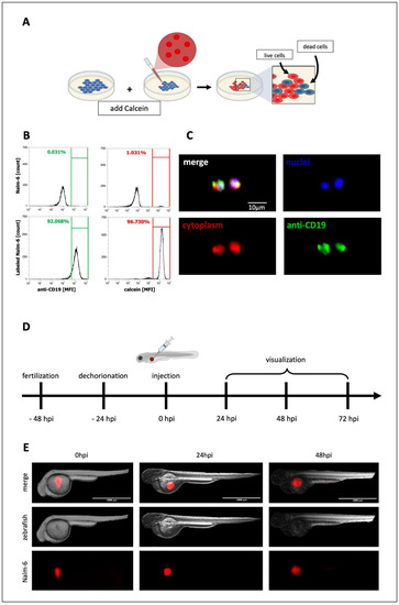 Localized xenograft zebrafish model: (A) Nalm-6 cells were labeled with Calcein-AM. After the internalization of Calcein-AM, the non-fluorescent Calcein-AM is converted in living cells to red-fluorescent Calcein-AM. Nalm-6 cells were also labeled with DAPI and anti-CD19 antibody (as described in materials and methods) and analyzed by (B) flow cytometric analysis and (C) immunofluorescence microscopy. Magnification 200×. Scale bar 10 μm. (D) Timeline of the experimental procedure. (E) Calcein-AM-labeled Nalm-6 cells were injected at 48 hpf in the perivitelline space of larvae. ZF were analyzed immediately after the injection (left panels), 24 hpi (central panels), and 48 hpi (right panels). Magnification 40×. Scale bar 1000 μm.
