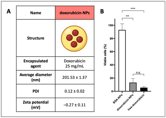 PLGA-PVA NPs filled with doxorubicin (doxorubicin-NPs) were produced and consisted of two parts, as previously described for BSA-NPs: the external shell and the inner core, which was composed of doxorubicin (25 mg/mL in a water buffer). Doxorubicin-NPs were tested in vitro, showing round shapes, a diameter lower than 300 nm, and a small negative surface charge. The average diameter, polydispersity index (PDI), and zeta potential values of these types of NPs are reported in Figure 5A.
