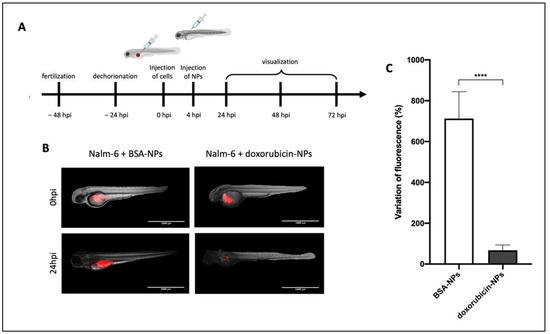 Evaluation of the therapeutic effect of doxorubicin-NPs: (A) Timeline of the experimental procedure. (B) Nalm-6 cells (labeled with red-fluorescent Calcein-AM) were injected into the perivitelline space of zebrafish embryos 48 hpf, and 4 h later, BSA-NPs (left panels) or doxorubicin-NPs (right panels) were injected in the duct of Cuvier. Zebrafish were analyzed immediately after the injection of NPs (upper panels) and 24 hpi (lower panels). Magnification 40×. Scale bar 1000 μm. (C) Data analysis of the variation of cells’ fluorescence after treatment with NPs expressed as a percentage of untreated animals. All data are reported as the mean ± SD. p ≤ 0.0001 = ****.