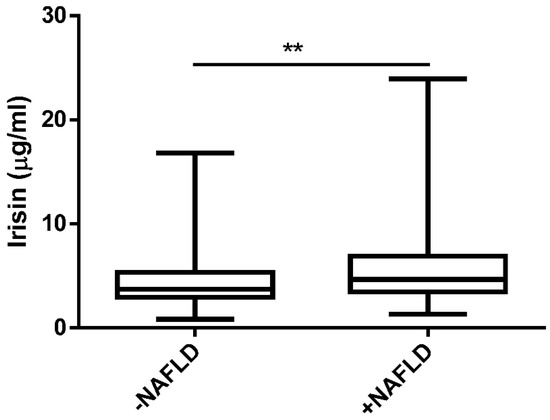 The serum level of irisin in patients without NAFLD (−NAFLD; n = 66) and with NAFLD (+NAFLD; n = 72), measured by ELISA. The data are expressed as medians with lower and upper quartiles and minimal and maximal values. **, p < 0.01 −NAFLD group vs. +NAFLD group.