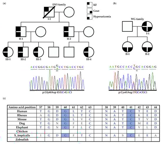 Pedigree and Sanger sequencing electropherogram showing UMOD variants in DY5 and WG families. (a) In the DY5 family, the UMOD p.Gly60Asp variant was shared among all the affected individuals. All the affected members had hyperuricemia but no gout episode and entered KF between the ages of 26 and 41. (b) The UMOD p.Cys41Arg variant was identified in the WG family. The affected members had gout, hyperuricemia, and CKD or KF. (c) The amino acids of Cys41 and Gly60 are well-conserved across different species.