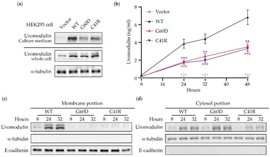 Empty vector, wildtype uromodulin, p.Cys41Arg uromodulin, and p.Gly60Asp uromodulin expression constructs were transiently transfected to HEK293 cells. After transient transfection, the culture medium was collected at 8, 24, and 32 h, then stored at −80 °C before measurement. For immunoblotting, the culture medium was condensed by Centricon (YM3, amicon, Merck/Millipore Sigma) before SDS-PAGE electrophoresis. ELISA was used to carry out measurements of the uromodulin in the culture medium according to the manufacturer’s instructions (EHUMOD, Invitrogen, Thermo Fisher Scientific). Briefly, the culture medium and standards were diluted in an assay diluent supplied in the kit and added to wells in duplicate. After 2.5 h of incubation at room temperature, the wells were washed with PBS, and the biotinylated uromodulin antibody was added. After 1 h of incubation at room temperature, the wells were rewashed, and a streptavidin-horseradish peroxidase secondary antibody was added. After 45 min of incubation at room temperature, the wells were rewashed, and the color was developed by adding TMB substrate solution and incubation in the dark at room temperature for 30 min. The reaction was stopped by adding the stop solution supplied in the kit, followed by reading immediately at OD450 and OD550. The culture medium’s uromodulin concentration was determined by interpolation on the standard curve.