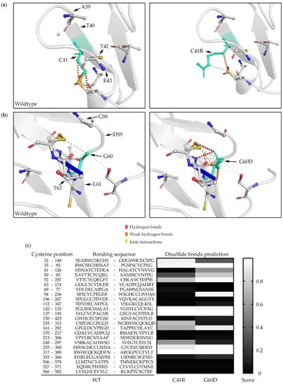 Uromodulin 3D structure and disulfide bond prediction. WT versus C41R (a) and WT versus G60D (b) were processed using DynaMut software. WT and mutant residues are colored in light green and are represented by sticks alongside the surrounding residues, which are involved in hydrogen bonds, weak hydrogen bonds, and ionic interactions. (c) Disulfide bond prediction of G60D and C41R uromodulin was analyzed using DiANNA software. The 24 disulfide bond positions and sequences of WT uromodulin are listed, and the prediction model shows that multiple disulfide bonds might be affected by C41R and G60D variants. WT: wildtype; G60D: p.Gly60Asp; C41R: p.Cys41Arg.