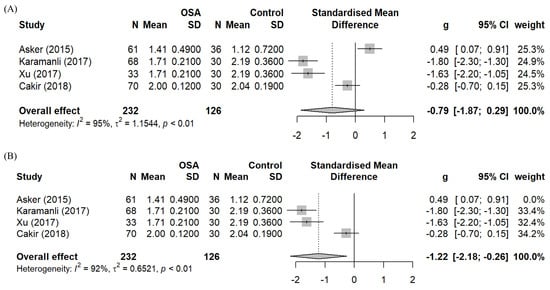 Forest plots–Meta-analyses of the standardised mean difference of the effects of OSA on serum Mg based on: (A) Four studies that compared the serum Mg levels of OSA patients to healthy controls [,,,]; (B) After exclusion of Asker et al. [].