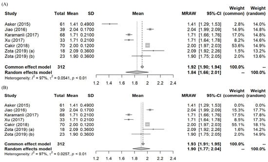 Forest plots–Meta-analyses of the mean serum Mg levels based on: (A) All included studies [,,,,,]; (B) After exclusion of Asker et al. []. (MRAW = untransformed mean). Two mean values were reported by Zota et al. []: (a) moderate OSA; (b) severe OSA. Both values were included in the analysis.
