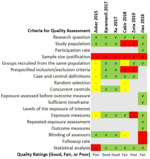The study adopted the Quality Assessment Tool for Case-Control, Observational Cohort and Cross-Sectional Studies published by the National Institute of Health for quality assessment of the included studies []. All authors rated the studies independently. Differences in rating were resolved through consensus after discussion.