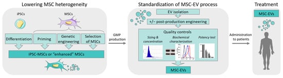 Extracellular vesicles (EVs) are being largely investigated with regard to their capacity to carry a large number of molecules (proteins, lipids, different RNA species, and DNA) that play a role in intercellular communication and might be of interest for therapeutic purposes [1]. Thanks to their presence in biological fluids, they might be used as biomarkers of diseases; they may also serve as biological targets to decipher pathophysiological processes or as therapeutic agents. In the latter situation, EVs derived from mesenchymal stromal cells (MSCs) are likely the most investigated type of EVs for diverse therapeutic applications, including inflammatory, degenerative, or acute diseases (for review, see [2]). While the number of clinical trials with MSC-based therapies has rapidly risen for a variety of indications, few of them have reached phase III. Only three phase III trials on graft-versus-host disease (GvHD) and Crohn’s disease have been completed and published so far [3,4]. Variability in clinical outcomes was attributed to variability in the functionality of MSCs related to the tissue source, donor, or manufacturing process. It can be anticipated that such variability will also be encountered when using MSC-derived EVs (MSC-EVs), which are being evaluated in some clinical trials [5].
