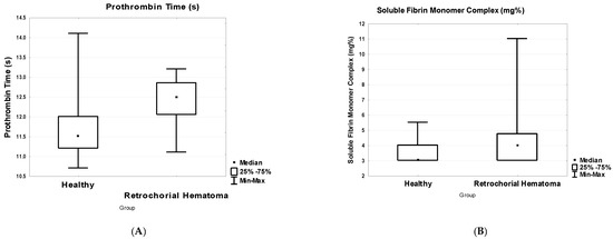 | Index | Normal Pregnancy, n = 57, Median (Q1;Q3) | Retrochorial Hematoma, n = 16, Median (Q1;Q3) | Significance Level of Differences according to the Mann–Whitney U Test, p-Value |
