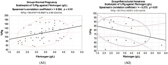| Gestation period (weeks) & Fibrinogen (g/L) | 57 | 0.351545 | 2.78489 | 0.007330 | 16 | −0.100603 | −0.37834 | 0.710851 |