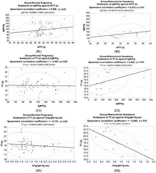 | %Plg/IgM-Plg ratio & TT (s) | 57 | −0.131466 | −0.98351 | 0.329663 | 16 | −0.644546 | −3.15430 | 0.007031 |