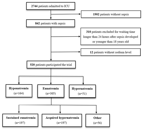 Of the 2744 patients admitted to the ICU of Kaohsiung Chang Gung Memorial Hospital between August 2013 and June 2016, 520 sepsis patients with available baseline serum sodium data were included in our final analysis (Figure 1). Of these patients, 164 (31.5%) had hyponatremia, 51 (9.8%) had hypernatremia, and 305 (58.7%) had eunatremia.