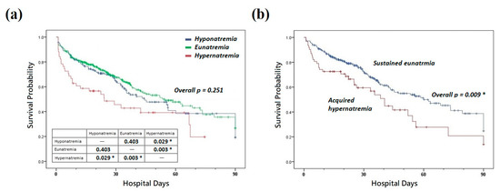 Kaplan–Meier survival curves for (a) patients with hyponatremia, eunatremia, and hypernatremia and (b) patients with sustained eunatremia and acquired hypernatremia. * p < 0.05.
