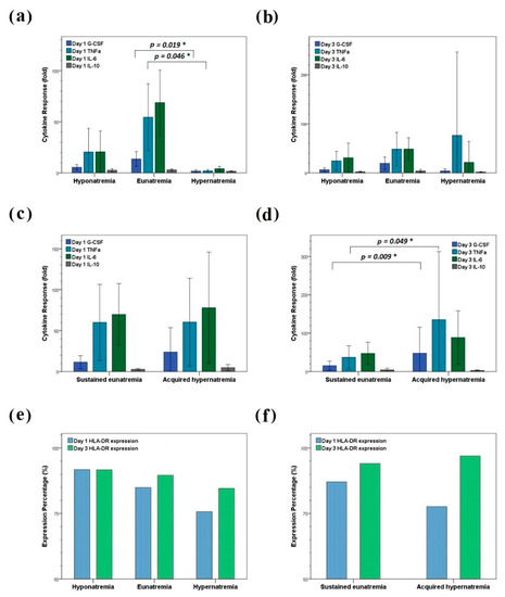 Day 1 HLA-DR-expressing monocyte percentages demonstrated significant differences among the hyponatremia, eunatremia, and hypernatremia groups (p = 0.025); moreover, the hypernatremia group demonstrated the lowest mean HLA-DR-expressing monocyte percentage (p (hypernatremia vs. hyponatremia) = 0.050; Figure 3e). However, day 1 or day 3 HLA-DR-expressing monocyte percentages revealed nonsignificant differences between patients with sustained eunatremia and those with acquired hypernatremia (Figure 3f). Medians and interquartile ranges of each cytokine response and HLA-DR-expressing monocyte percentage are listed in Table 4.
