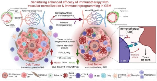 Enhancing immunotherapy in Glioblastoma (GBM) with the reciprocal regulation of the vascular normalization and immune reprogramming. The “cold”, immunosuppressive tumor microenvironment (TME) in GBM is depicted with no effector T cells, dendritic cells (DCs) and natural killer (NK) cells but with immunosuppressive myeloid derived suppressor cells (MDSCs), M2-like glioma associated macrophages (GAMs) and T regulatory cells (Tregs). The “cold” tumor TME is characterized with abnormal tumor blood vessels that are tortuous and leaky due to irregular basement membrane, aberrant endothelial cells (ECs) with loose tight junctions, and immature and irregular pericyte coverage. These events lead to less perfusion and oxygenation (hypoxia) which increases an acidic microenvironment, consequently leading to increased edema, interstitial pressure, less drug delivery and unsuccessful immunotherapy. Using a judicious (normalized) dose of anti-angiogenics, vessel normalization can be attained where the basement membrane is regular, with proper ECs, tight junctions and matured pericyte coverage that fortify the vessels leading to increased vessel perfusion, oxygenation and reducing acidosis. Less edema and interstitial pressure create a conducive TME for homing effector T cells and creating “hot” immunostimulatory TME that homes DCs, NK cells and no or less Tregs and MDSCs. M1-like macrophages are present along with microglia, and other stromal cells. This reciprocal regulation of vascular normalization leading to immune reprogramming and vice versa sensitizes the “hot” tumor for effective immunotherapy. The purple large arrow shows that by reciprocal regulation of immune reprogramming and normalized dose of anti-angiogenics can induce vessel normalization from abnormal vessel architecture. The red arrows depict immune characteristics of “cold tumor with increased MDSCs and Tregs and less T effector cells and more M2 like GAMs leading to increased edema, interstitial pressure, acidosis, and less tumor perfusion, oxygenation, drug delivery and less affective immunotherapy. The green arrows depict immune characteristics of “hot” tumor with less MDSCs and Tregs and more T effector cells and more M1 like GAMs leading to decreased edema, interstitial pressure, acidosis, and more tumor perfusion, oxygenation, drug delivery and more affective immunotherapy. Created with BioRender.com.