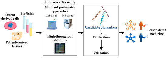 Biomarker discovery by proteomics. Proteomics represents the most promising approach to the identification of reliable disease biomarkers, both in the central nervous system and at the periphery. The discovery phase starts with the choice of the appropriate biological sample (patient-derived biofluids, cells, and tissues). The proteomics analysis is then performed, either by standard methods (see Section 3.1) or by newly developed, automated high-throughput platforms (see Section 3.2). Candidate biomarkers derived from the discovery phase are then subjected to verification and validation processes. Validated molecules will: (i) work as diagnostic/prognostic indicators; (ii) allow patients’ stratification; (iii) predict individual drug response; key steps towards personalized medicine.