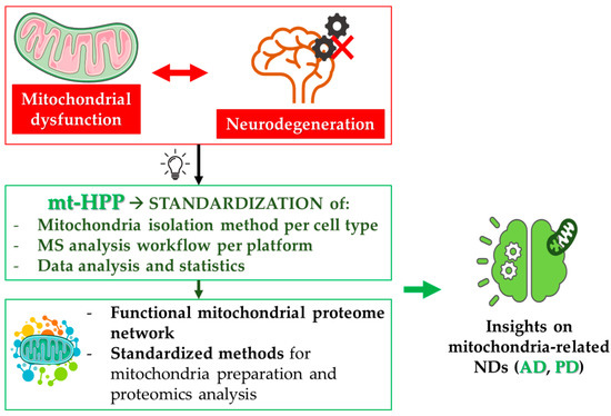 Mitochondria and neurodegeneration. Mitochondrial dysfunction represents one of the most frequent pathological alterations in NDs. Indeed, the failure of the tightly regulated mitochondrial quality control contributes to neuron death. The mitochondria-centered initiative of the Human Proteome Project (mtHPP), which aims at the in-depth investigation of the mitochondrial proteome in health and disease, has enabled the standardization of procedures related to mitochondria isolation and quantitative analysis of mitochondrial proteins (see Section 4.1). The fulfillment of the objectives of this project will achieve important advances in the understanding of several NDs, especially AD and PD (see Section 4.2 and Section 4.3, respectively).