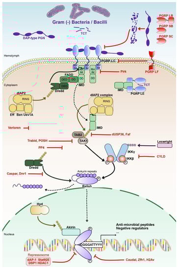 | In the cytosol | PGRP-LE IMD FADD Dredd dIAP2 Eff Ben Uev1A TAB2 TAK1 IKKβ IKKγ Leswright Relish (Full) | Verloren dUSP36 Faf Trabid POSH PP4 CYLD Caspar Dnr1 |