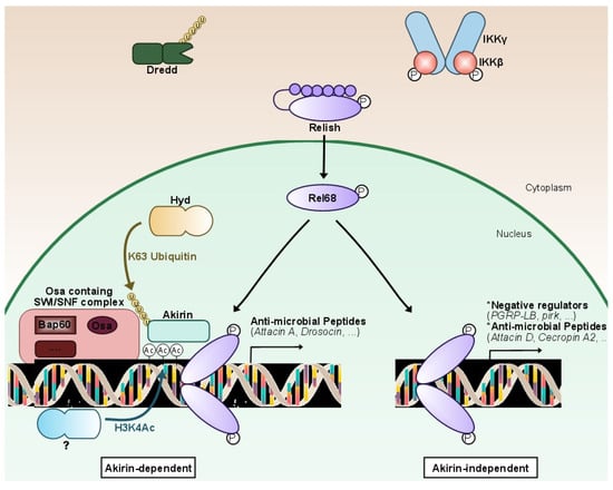 - Bonnay, F.; Nguyen, X.-H.; Cohen-Berros, E.; Troxler, L.; Batsche, E.; Camonis, J.; Takeuchi, O.; Reichhart, J.-M.; Matt, N. Akirin specifies NF-κB selectivity of Drosophila innate immune response via chromatin remodeling. EMBO J. 2014, 33, 2349–2362. [Google Scholar] [CrossRef]