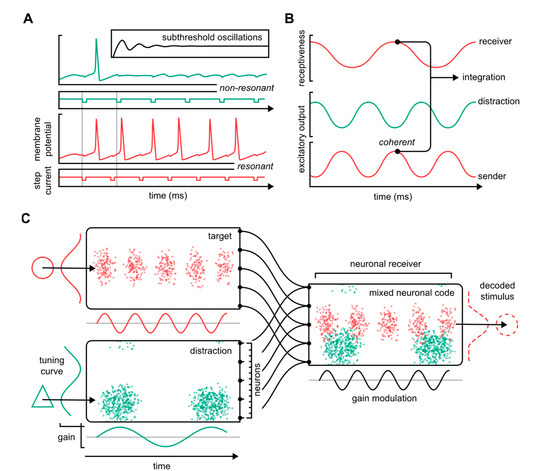 Neuronal dynamics. (A) Resonance of the neuronal membrane potential facilitates the selective transfer of information. The traces show a Hodgkin–Huxley neuron receiving step current pulses at two different frequencies (green: low frequency—red: high frequency). When the pulses do not resonate with the neuron’s underlying resonance tendency, the signals are poorly integrated (green). When pulses do resonate, the neuron integrates and transmits the signals onward (red). The inset shows spontaneous subthreshold oscillations. (B) In the “communication through coherence”-framework, neuronal inputs systematically arrive at moments of high receptiveness, or input gain. (C) Oscillation-based neuronal communication differentiated by frequency enables the multiplexing of information. The figure is based on a model originally described by Akam and Kullmann [23]. Two neuronal populations with differing stimulus sensitivities (“tuning curves”) connect to the same post-synaptic neuronal receiver. The mixed neuronal code is decoded via the receiver’s input gain that matches the target stimulus input train. Red: target. Green: distraction.