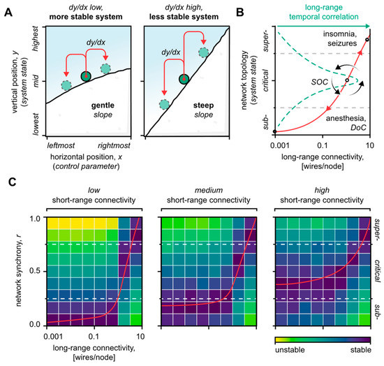 Roles of neuronal connectivity. (A) Brain system analogy. The system’s state corresponds to the vertical position of the ball, and the system’s “control parameter” corresponds to the ball’s horizontal position. When the slope steepens, changes to the control parameter cause a greater change in the system’s state (dy/dx increases). The system has destabilized. (B) Overview of the topological model. The long-range connectivity is the control parameter that defines the state of the system, represented by a point along the curve. Short-range connections modulate the system dynamic, i.e., the shape of the curve. The curve’s steepness reflects the system’s stability. Sub-critical states are marked by fragmented activity, such as disorders of consciousness (DoC), while super-critical states favor global activity, such as seizures. Near the critical state, the system fluctuates between the local and global modes of operation via self-organized criticality (SOC), counter-balancing the intrinsic topological propensities that pull the system to its extremes (red arrowheads). The brain’s computational power peaks near criticality, mirrored by the peak in the long-range temporal correlation. The long-range temporal correlation curve (green dashes) and disease mappings (black, in-figure text) were adapted with permission from Zimmern (2020) [30]. (C) Stability heat-maps based on artificial neural network simulations. Notice the change in the stability map as short-range connectivity decreases. Importantly, as short-range connectivity weakens, the critical regime is destabilized in favor of especially sub-critical system states. Figure adapted from the authors’ previous work [31].