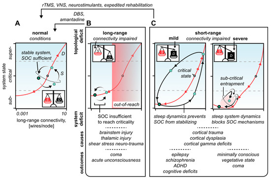 Summary of the hypothesis. (A) Under normal conditions, the SOC mechanisms perfectly balance out the system’s topological propensities (see inset). Thus, the system manages to maneuver the critical state to facilitate local (sub-) and global (super-) neurocomputations. (B) When long-range connections are impaired, such as by brainstem shear stress, the system’s SOC mechanisms are acutely voided (see inset). This shifts the system toward sub-criticality to an extent that corresponds to the severity of the long-range neuronal injury. Transient loss of consciousness occurs in complete, but reversible, disruption of the long-range neuronal connectivity. In irreversible cases, the extent of long-range injury corresponds to the depth of unconsciousness, ranging from minimally conscious to fully comatose states. Rehabilitation strategies include thalamic neuromodulation, e.g., through DBS or neurostimulant pharmacotherapy, to augment the thalamocortical loop interactions. (C) When short-range connections are impaired, such as by a neuro-traumatic cortico-dysfunction, the system’s topological propensities are intensified (see insets). In mild cases, this makes the system fluctuate between extreme dynamical regimes because the SOC mechanisms fail to stabilize near the critical state. In severe cases, the system is effectively trapped in a sub-critical trough in which SOC is completely blocked by the system’s now intense topological propensities. Potential therapeutic strategies include repeated TMS to potentiate cortical short-range connectivity or expedited acute rehabilitation to reduce neuroplastic synaptic depression in neuro-traumatic patients. S, SOC mechanisms; D, the system’s topological propensities; rTMS, repeated transcranial magnetic stimulation; VNS, vagus nerve stimulation; DBS, deep brain stimulation; ADHD, attention deficit hyperactivity disorder. Insets show the balances between the system’s SOC mechanisms and its topological propensities.