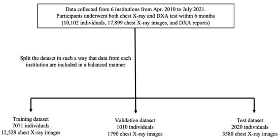 We randomly split the dataset collected from each hospital into training, validation, and testing datasets. We ensured that the data for each of the three labels (normal, osteopenia, and osteoporosis), in conjunction with their corresponding chest radiographs, age, and sex ratios, were randomly distributed in balanced numbers among the training, validation, and test datasets. The splitting ratios for the training, validation, and test datasets were 70%, 10%, and 20%, respectively. Figure 1 shows a flowchart of the dataset creation process, which ensured that the test dataset contained only new chest X-ray images that the model did not encounter during the training.