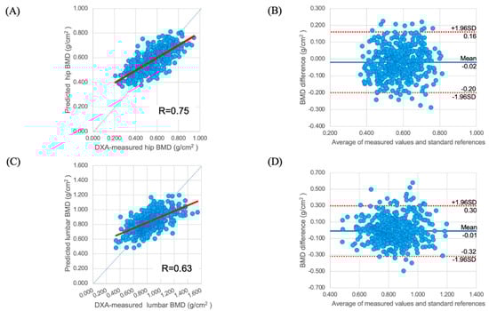 The correlation plot and Bland–Altman plots for BMD predicted by the deep learning model and true BMD are shown in Figure 2. The predictive performance indices for femoral BMD are as follows: R-value of 0.75, R2 of 0.54, and MAE of 0.08. The predictive performance indices for lumbar spine BMD are as follows: R-value of 0.63, R2 of 0.40, and MAE of 0.12.