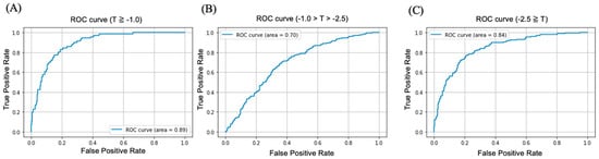 Receiver operating characteristic curve (ROC) for each class: (A) T-score greater than or equal to −1.0; (B) T-score between −1.0 and −2.5; (C) T-score less than or equal to −2.5.