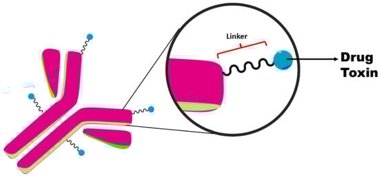 One of the main components of the ADC structure is also a mAb, which serves to increase selectivity by targeting the drug to tumors. ADCs have three main components, namely the mAb, a drug or toxin, and a biodegradable linker. The latter are characterized by being acid-cleavable, protease-cleavable, and hydrolysis-cleavable, or they can be cleaved by lysosomal enzymes before being released at the target [8] (Figure 1). These conjugated drugs have high selectivity, and they limit the exposure of healthy tissues to the cytotoxic agent. By providing the link between antibody and drug, the chemical ligand has the characteristic of being stable so that the drug can travel through the body and be released into the target tissues. In addition to showing stability in physiological conditions, the cytotoxic payload must have a conjugation functional group that allows it to be released in the desired manner to the target. [9,10]. For example, Moxetumomab Pasudotox LumoxitiTM, which is used to treat capillary leukemia, is the conjugate of a fragment of an anti-CD22 mAb with a fragment of Pseudomonas exotoxin [11]. Therefore, this ADC combines the tumor-targeting capacity of the antibody and the antitumor activity of the toxic payload.