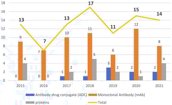 The data collected in the present work point to an undeniable growth of biological therapies. In the period from 2015 to 2021, the FDA authorized new mAbs, ADCs and proteins. Of note, the total number of approvals remained in double figures every year except 2016, in which only seven biopharmaceuticals, all mAbs, were approved (Figure 2). Analysis of the data also revealed the prominence of the authorization of mAbs compared to other biologicals.