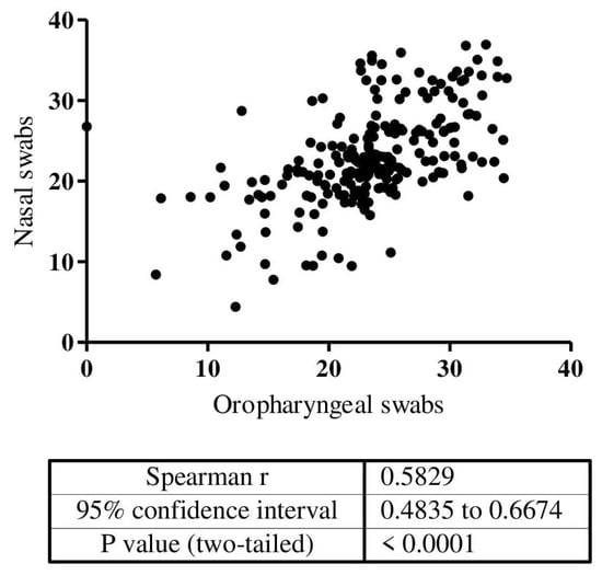 We first evaluated the performance of self-collected SteriPack nasal swabs when compared to oropharyngeal swabs in 1498 patients with suspected SARS-CoV-2 infection (Table 2). The overall sensitivity, specificity, positive predictive value (PPV), and negative predictive value (NPV) were 80.6% (95% CI: 75.3–85.2%), 96.4% (95% CI: 95.2–97.4%), 83.1% (95% CI: 78.0–87.4%), and 95.8% (95% CI: 94.5–96.8%), respectively. The observed result agreement between the two types of swabs was 93.5% (95% CI: 34.7–94.7%). Among the 213 patients with SARS-CoV-2 positive results on paired swabs, there was good correlation (r = 0.58; p < 0.0001) of the amount of virus detected as measured by the Ct value (Figure 1). The median Ct value in the evaluation of nasal swabs was 22.41 (Min-Max: 4.4–36.9) for self-collected nasal swabs and 23.67 (Min-Max: 5.7–34.7) for oropharyngeal swabs (p = 0.068).