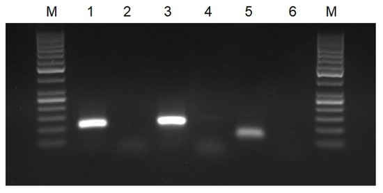 Agarose gel electrophoresis of PCR products: M—molecular DNA marker 100 bp; 1—PCR for gene RdRP (primers nCoV_IP4-14059Fw/Rv); 2—negative control for gene RdRP; 3—PCR for gene E (primers E_Sarbeco_F/R); 4—negative control for gene E; 5—PCR for gene N (primers 2019-nCoV_N2-F/R); and 6—negative control for gene N.