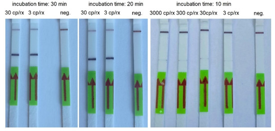 An example of RT-HDA combined with LFA performed using serial dilutions of the synthetic template and various incubation times.