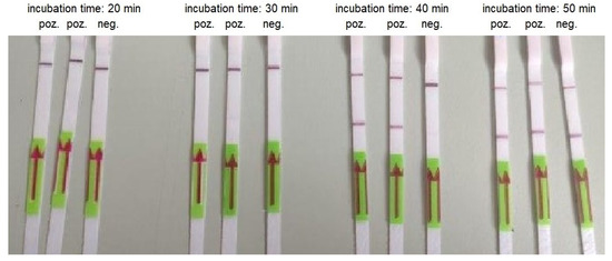 The nucleic acid amplification methods can be combined with colorimetric detection, which enables one to read results directly in a test tube by the color change. Various color indicators might be used, such as pH indicators, ds-DNA binding dyes, and metal ions indicators [10,25]. However, the color change might be disturbed by various factors, for example, substances present in an unpurified sample or the pH of a sample. Moreover, a color change read by the eye might be problematic, especially when the color change is partial. The application of LFA ensures that the interpretation of results is easy: the test band is fully visible, and the control band is able to verify if the results are not disturbed by unknown factors.
