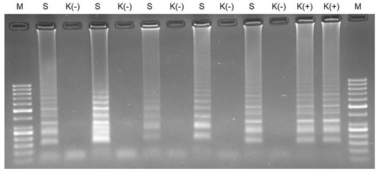 Agarose gel electrophoresis of RT-LAMP for clinical samples conducted for 40 min. M—molecular DNA marker 100 bp; S—clinical sample; K (-)—negative control; and K (+)—AMPLIRUN SARS-CoV-2 RNA control at concentration 3000 copies/reactions.