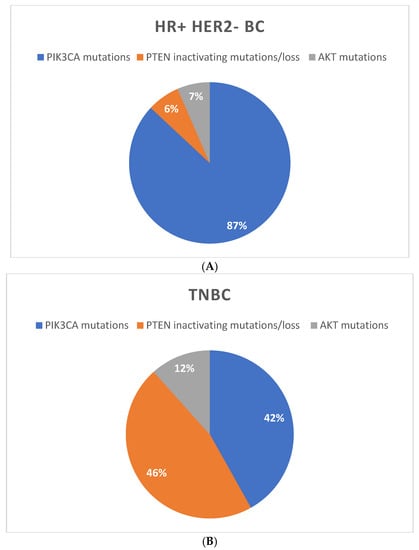 Of note, the phosphatidylinositol 3-Kinase (PI3K)/protein kinase B (AKT)/mammalian target of rapamycin (mTOR) pathway is an important signaling pathway involved in treatment failure. The main causes of pathway deregulation are PIK3CA mutations, AKT mutations or tensin homolog (PTEN) loss [2]. Pathway dysregulations are known mechanisms of endocrine resistance, as well as anti-HER2-targeted agent resistance [3,4,5,6,7]. PI3K/AKT/mTOR mutations are more frequent in hormone receptor-positive (HR+) BC compared to other BC subtypes [5].