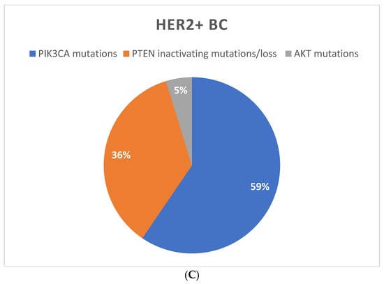 Frequency of PI3K/AKT/mTOR mutations in different breast cancer subtypes: (A) HR positive HER2 negative BC, (B) TNBC and (C) HER2 positive BC, respectively.