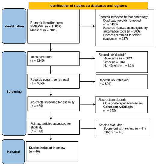 PRISMA 2021 Flow diagram for new systematic review which includes searches of database and registers only. Consider, if feasible to do so, reporting the number of records identified from each database or register searched (rather than the total number across all databases/registers). ** If automation tools were used, indicate how many records were excluded by a human and how many were excluded by automation tools. From: McKenzie et al. [18] (Supplementary Table S1).
