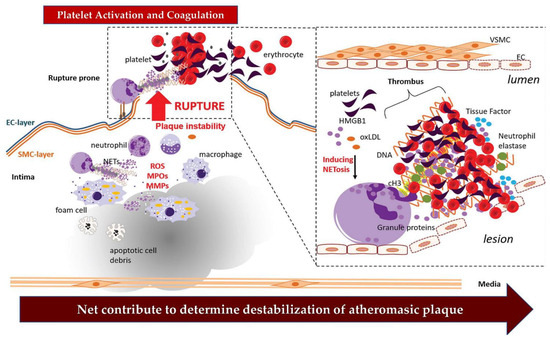 An important contribution to the knowledge of the pathophysiological process that favors the progression of the atheromatous plaque and its complications was provided by the study on the infiltration of neutrophils and consequent destabilization of the atheromatous lesion. Ionita et al. [76] studied the morpho-functional alterations of the atheromatous plaque emphasizing the peculiar characteristic of the cellular infiltrate. The authors described lesions characterized by marked infiltration of neutrophils substantially present in plaques with a large lipid core. Again, they recorded an abundant concentration of macrophages and a marked modification of the vascular architecture, which was testified by a reduction in the amount of collagen fiber and SMC expression. Taken together, these alterations suggested the crucial role of neutrophils in plaque destabilization processes, with two key elements to underline, necrotic nucleus growth and thinning of the fibrous cap [76]. Given the importance of the lesions sustained by an abnormal growth of the necrotic nucleus and the thinning of the fibrous cap, Silvestre-Roig et al. [54] observed that these two anatomopathological conditions were the indication of an excessive concentration of neutrophils-triggering inflammation and in particular of the generation of NETs in promoting the destabilization of the plaque [77].