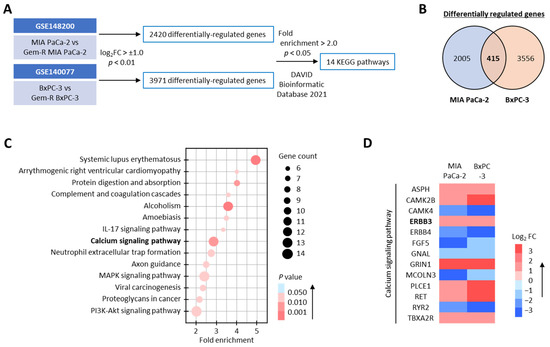First, we undertook a comprehensive genomewide transcriptomic profiling analysis in parental and Gem-R PDAC cells from publicly available datasets (GSE148200 and GSE140077) to identify the most critical signaling and regulatory pathway correlated with Gem resistance. In this analysis, we discovered that 2420 and 3971 differentially regulated genes (log2FC > ±1.0, p < 0.01) in MIA PaCa-2 and BxPC-3 cell lines, respectively (Figure 1A), while 415 genes were shared between both these PDAC cell lines (Figure 1B). When we performed pathway enrichment analyses on these 415 genes using DAVID bioinformatic database 2021 (https://david.ncifcrf.gov/ [accessed on 23 November 2022]) [41], 14 KEGG pathways were found to be preferentially enriched (Fold enrichment > 2.0, p < 0.05; Figure 1A,C). Among these, calcium signaling emerged as one of the most relevant signaling pathways because it has also received considerable attention in recent years for its role in mediating chemotherapeutic resistance in various cancers [15,16,17,18]. Therefore, we focused further attention on exploring the role of this pathway for Gem resistance in PDAC cells (Fold enrichment: 2.8, p = 0.002; Figure 1C) and noted that 13 genes were differentially regulated in PDAC cells with and without resistance to Gem (Figure 1D). Taken together, these results suggested that the calcium signaling pathway might play a significant role in Gem resistance in PDAC cells, and we selected this pathway for subsequent experiments.