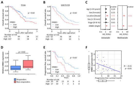 Among the 13 differentially regulated genes in the calcium signaling pathway, ERBB3, a member of the epidermal growth factor receptor, is considered to have a critical oncogenic role in pancreatic cancer pathogenesis, disease progression, and acquisition of chemoresistance [58,59,60] and more importantly, has recently gained increased attention as a potential therapeutic target in PDAC [60,61]. Based on these findings, we focused on ERBB3 and assessed its impact on survival and prognosis in PDAC patients. When we analyzed two public datasets (TCGA and GSE71729), wherein we observed that the OS was significantly reduced in the patient group with high ERBB3 expression in both TCGA (3-year OS: 46.8% vs. 26.9%; p = 0.02; Figure 2A) and GSE71729 (3-year OS: 27.0% vs. 16.1%; p = 0.02; Figure 2B) datasets. Furthermore, in multivariate Cox regression analysis for OS in the TCGA dataset, ERBB3 level was a significant independent prognostic factor of OS (hazard ratio [HR]: 1.59; 95% confidence interval [CI]: 1.03–2.47; p = 0.04; Figure 2C). Overall, these results highlighted that high ERBB3 expression was significantly associated with poor prognosis in PDAC patients.