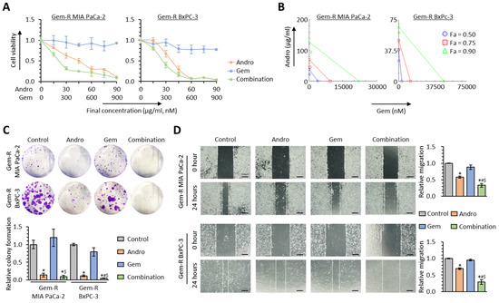 Next, Andro’s chemosensitizing properties were assessed in colony formation and wound healing assays. With regard to the colony formation assays, the combination of Andro and Gem significantly reduced cellular clonogenicity compared to either treatment individually (p = 0.27 vs. Andro; p = 0.02 vs. Gem in Gem-R MIA PaCa-2; p = 0.02 vs. Andro; p < 0.01 vs. Gem in Gem-R BxPC-3; Figure 3C). Similarly, the wound healing assays revealed that the combined treatment resulted in significant inhibition of migration in Gem-R MIA PaCa-2 (FC = 0.58 vs. Andro, p = 0.03; FC = 0.38 vs. Gem, p < 0.01) and Gem-R BxPC-3 cells (FC = 0.42 vs. Andro, p = 0.03; FC = 0.31 vs. Gem, p < 0.05; Figure 3D). Collectively, these data confirmed that Andro significantly enhanced the chemosensitivity to Gem and even reversed Gem resistance in Gem-R PDAC cells.
