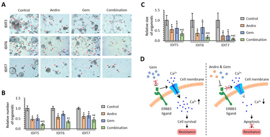 Tumor 3D-organoids from patients with PDAC were generated as described previously [56]. Patients were anonymously coded in compliance with the Declaration of Helsinki, and written informed consent was obtained from all patients with approval from the ethics committees of the institution. The tumor organoids were suspended in a 24-well plate such that they formed a dome in 40 μL of Matrigel (Corning, Tehama County, CA, USA) with 500 μL of PancreaCultTM Organoid Growth Medium (100-0781, STEMCELL Technologies, Vancouver, BC, Canada) containing epidermal growth factor (STEMCELL Technologies). The 3D-organoids were treated with appropriate concentrations of Andro, Gem, and their combination. The control organoids were treated with a very low concentration of DMSO. Tumor organoids about 50 microns in diameter were observed under a bright-field microscope (magnification 100×). The number and size of organoids were measured using the Image-J 1.53 s software.