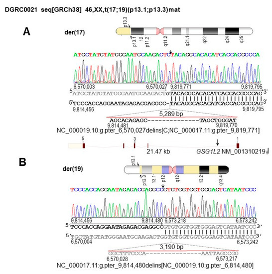 Mapping and identification of the breakpoints at nucleotide resolution by liGS, followed by SS of the breakpoint spanning amplicons, defines the 17p13.1 breakpoint at NC_000017.11:g.9,814,480, within IVS1 of GSG1 like 2 gene (GSG1L2), whereas the 19p13.3 breakpoint at NC_000019.10:g.6,570,027 is within a low complexity region comprising several LINE elements. Deletions were identified at both breakpoint junctions: a 5.3 kb (NC_000017.11:g.9,814,480_9,819,771del) at 17p13.1 and a 3.2 kb (NC_000019.10:g.6,570,027_6,573,218del) at 19p13.3 (Figure 1). Hence, the translocation was classified as unbalanced and revised as seq[GRCh38] t(17;19)(19pter → 19p13.3::17p13.1 → 17qter;17pter → p13.1::19p13.3 → 19qter)mat.