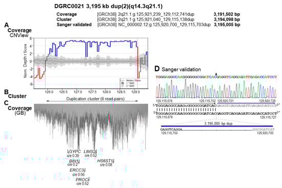 Concomitantly, the proper pairs were selected, and submitted to cn.MOPSv1.24 for identification of deletions and duplications based on depth-of-coverage (DoC) [10]. Lastly, the results from cluster and coverage analysis were merged and manually filtered. For graphical representation of CNVs, the selected proper pairs file was submitted to CNView [11] for coverage plot draw, and to the UCSC genome browser (http://genome.ucsc.edu, accessed on 14 December 2022), for large region alignment visualization and plotting. Structural and CNVs were interpreted using the comprehensive, clinically oriented SVInterpreter Web-application [5].