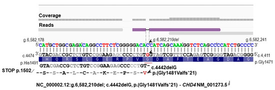As the pathogenic effect of the identified genomic variants was unclear and no additional, potentially pathogenic CNV could be identified, ES was performed, with an average coverage of 125×. This analysis revealed a novel variant in exon 30 of the Chromodomain helicase DNA binding protein 4 (CHD4, OMIM *603277, NM_001273.5), NC_000002.12:g.6,582,210del; c.4442delG, p.(Gly1481Valfs*21). Afterwards, as an independent assay replacing Sanger sequencing, the frameshift variant was confirmed in the liGS data; however, due to low sequence coverage of liGS, this frameshift single-nucleotide deletion was identified only in a single GS read (Figure 3). This variant is within a domain of unknown function (DUF) 1086 in the C-terminal region of CHD4 and is predicted to result in nonsense-mediated decay [13].