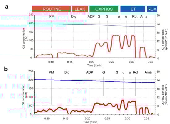 - Doerrier, C.; Garcia-Souza, L.F.; Krumschnabel, G.; Wohlfarter, Y.; Meszaros, A.T.; Gnaiger, E. High-Resolution FluoRespirometry and OXPHOS Protocols for Human Cells, Permeabilized Fibers from Small Biopsies of Muscle, and Isolated Mitochondria. Methods Mol. Biol. 2018, 1782, 31–70. [Google Scholar] [CrossRef]